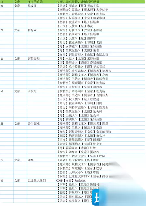 女皇 王后的项链(宝魔) 无法合成 母夜叉 ·魔术师Lv2・杰克灯笼×倒悬者Lv9・花魂 ·正義Lv9・天使×星Lv11・木灵 ·女教皇Lv6・希路奇×皇帝Lv16・埃力格 拉弥亚 ·太阳Lv16・朱雀×月亮Lv24・水鬼 ·皇帝Lv16・埃力格×女教皇Lv26・伊西丝 ·力量Lv20・鬼×顾问官Lv22・和魂 ·倒悬者Lv21・欧特鲁斯×魔术师Lv23・睡魔 诃梨帝母 ·法王Lv25・安祖×信念Lv27・塔姆林 ·倒悬者Lv26・建御名方×魔术师Lv28・克伦佐 ·命运Lv27・可罗索×節制Lv33・密特拉 ·女教皇Lv26・伊西丝×皇帝Lv36・图特 荼吉妮 ·命运Lv35・拉克西斯×節制Lv45・白虎·太阳Lv39・米特拉斯×月亮Lv43・基力梅卡拉 ·塔Lv41・红骑士×愚者Lv42・欧赛 ·力量Lv44・女武神×顾问官Lv44・阿难陀 蒂妲妮亚 ·愚者Lv49・巴古斯×塔Lv51・赛特 ·命运Lv46・福图娜×節制Lv55・那伽之王 ·恋愛Lv48・纳西瑟斯×太阳Lv53・象头神 ·女教皇Lv50・妙音天女×皇帝Lv52・巴隆 迦梨 ·太阳Lv53・象头神×月亮Lv60・莉莉丝 ·女教皇Lv53・丝卡蒂×皇帝Lv61・霜精之王 ·恋愛Lv56・帕尔瓦蒂×塔Lv59・黑骑士 ·倒悬者Lv60・摩洛×魔术师Lv63・佛钮司 威灵 ·信念Lv65・大元帅明王×法王Lv67・毘沙门天 ·星Lv68・婆苏吉×正義68・主天使 ·太阳Lv66・羽蛇神×月亮70・拜亚基 ·魔术师Lv63・佛钮司×倒悬者Lv73・马卡布 巴比伦大银妇 ·倒悬者Lv82・阿提斯×魔术师Lv83・斯尔特 ·皇帝Lv82・巴力×女教皇Lv83・西布莉 ·正義Lv81・尤利尔×星Lv84・哈斯塔 •星Lv80・斯拉欧加×正義Lv89・梅塔特隆