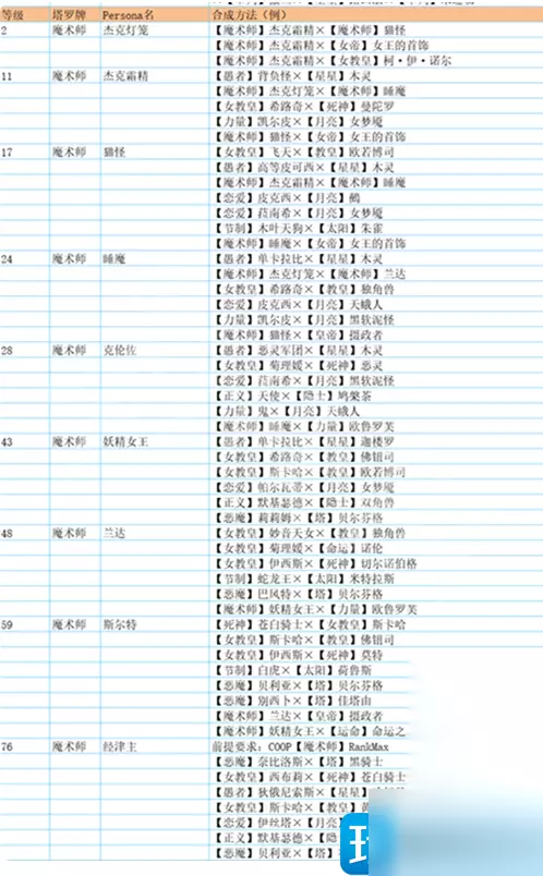 魔术师 杰克灯笼 ·魔术师Lv11・杰克霜精×魔术师Lv5・猫妖精 ·魔术师Lv5・猫妖精×女帝Lv15・王后的项链(宝魔) 猫妖精 ·死神Lv3・曼陀罗×女教皇Lv6・希路奇 ·恋愛Lv2・皮克希×月亮Lv7・女梦魔 杰克霜精 ·力量Lv6・凯尔皮×月亮Lv7・女梦魔 ·女教皇Lv6・希路奇×法王Lv9・比利士 ·死神Lv3・曼陀罗×女教皇Lv11・飞天 ·正義Lv9・天使×隠者Lv9・克鲁波克鲁 ·愚者Lv8・背负怪×星Lv11・木灵 猫妖 ·正義Lv9・天使×隠者Lv13・一本踏鞞 ·星Lv11・木灵×愚者Lv16・高等皮克希 ·女教皇Lv11・飞天×法王Lv17・欧若博司 睡魔 ·月亮Lv18・黑软泥怪×恋愛Lv19・菈南希 ·太阳Lv16・朱雀×節制Lv22・持国天 ·愚者v16・高等皮克希×星v23・风鬼 克伦佐 ·力量Lv24・罗刹×月亮Lv26・水鬼 ·法王Lv25・安祖×女教皇Lv26・伊西丝 ·女教皇Lv26・伊西丝×命运Lv27・可罗索 妖精女王 ·正義Lv29・权天使×隠者Lv31・鞍马天狗 ·死神Lv28・毕舍遮×顾问官Lv32・单卡拉比 ·力量Lv31・增长天×月亮Lv33・天蛾人 ·恶魔Lv32・莉莉姆×塔Lv37・贝尔芬格 兰达 ·塔Lv41・红骑士×恶魔Lv45・帕祖祖 ·月亮Lv43・基力梅卡拉×力量Lv44・女武神 ·太阳Lv43・虹蛇×節制Lv45・白虎 ·月亮Lv43・基力梅卡拉×恋愛Lv48・纳西瑟斯 佛钮司 ·愚者Lv49・巴古斯×星Lv52・迦楼罗 ·女教皇Lv50・妙音天女×法王Lv52・御社宫司神 ·女教皇Lv50・妙音天女×命运Lv52・诺伦 ·太阳Lv53・象头神×節制Lv55・那伽之王 斯尔特 ·女帝Lv63・迦梨×信念Lv65・大元帅明王 ·恶魔Lv58・巴风特×塔Lv73・魔罗 ·力量Lv63・哈奴曼×月亮Lv70・拜亚基 ·愚者Lv67・邪恶霜精×星Lv68・婆苏吉 经津主 ·女教皇Lv83・西布莉×死神Lv83・爱丽丝 ·正義Lv81・尤利尔×隠者Lv86・法夫纳 ·愚者Lv83・毗湿奴×星Lv84・哈斯塔 ·信念Lv84・齐格菲×女帝Lv85・巴比伦大银妇