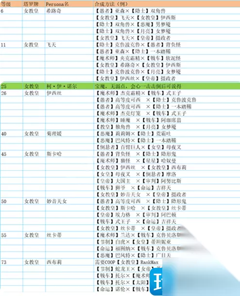 女教皇 希路奇 ·愚者Lv1・亚森×隠者Lv4・双角兽 ·魔术师Lv2・杰克灯笼×戦車Lv3・阿珈席翁 ·隠者Lv4・双角兽×月亮Lv7・女梦魔 飞天 ·隠者Lv4・双角兽×愚者Lv8・背负怪·戦車Lv3・阿珈席翁×魔术师Lv11・杰克霜精·月亮Lv7・女梦魔×法王Lv9・比利士 光之山(宝魔) 无法合成 伊西丝 ·魔术师Lv2・杰克灯笼×戦車Lv18・式王子 ·魔术师Lv11・杰克霜精×星Lv11・木灵 ·隠者Lv9・克鲁波克鲁×愚者Lv16・高等皮克希 ·月亮Lv12・阴魔罗鬼×法王Lv17・欧若博司 菊理媛 ·女帝Lv26・拉弥亚×倒悬者Lv26・建御名方 ·皇帝Lv25・瑟坦特×信念Lv27・塔姆林 ·戦車Lv25・金鬼×魔术师Lv28・克伦佐 ·隠者Lv31・鞍马天狗×恶魔Lv32・莉莉姆 妙音天女 ·愚者Lv38・恶灵军团×隠者Lv42・鸠槃荼 ·戦車Lv38・白骑士×魔术师Lv43・妖精女王 ·女帝Lv40・诃梨帝母×倒悬者Lv42・百臂巨人 ·信念Lv39・独角兽×顾问官Lv44・阿难陀 丝卡蒂 ·魔术师Lv48・兰达×星Lv52・迦楼罗 ·女帝Lv50・荼吉妮×倒悬者Lv51・佳塔由 ·太阳Lv47・荷鲁斯×死神Lv54・苍白骑士 ·魔术师Lv48・兰达×戦車Lv55・克鲁贝洛斯 斯卡哈 ·皇帝Lv52・巴隆×信念Lv54・大国主 ·太阳Lv53・象头神×死神Lv54・苍白骑士 ·太阳Lv53・象头神×戦車Lv55・克鲁贝洛斯 ·信念Lv54・大国主×顾问官Lv57・八咫鸟 西布莉 ·倒悬者Lv73・马卡布×女帝Lv81・威灵 ·顾问官Lv71・狄俄尼索斯×信念Lv84・齐格菲 ·信念Lv76・库夫林×顾问官Lv80・瓦胡·马纳 ·审判Lv75・阿巴顿×皇帝Lv82・巴力