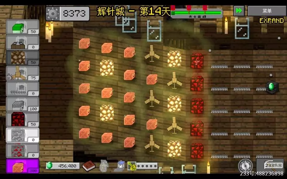 后期再有了一列铜投之后,搭配双红石矿能量基本不缺,就把一列月光传感器换成石头投掷器,如果遇到陨石法师,那就在后排挖放发光黑曜石,注意一定要放了之后马上挖炸,不然就会被魅惑,这关没有狂战士,不用担心尖子方块被炸,一条路上即使这时还没有来空中,敌人也要先放上木风扇,因为大部分时候灵头王都是几路一起来的,