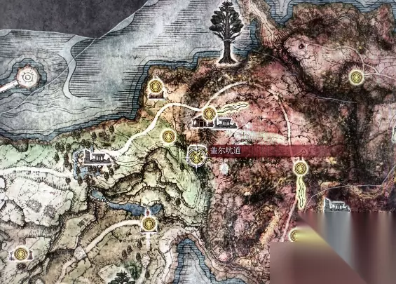 1、这个名刀月隐是可以在【盖尔坑道】中获取的; 2、艾尔登法环盖尔坑道在地图的中部位置,红色与绿色的边缘处,具体位置如下图: