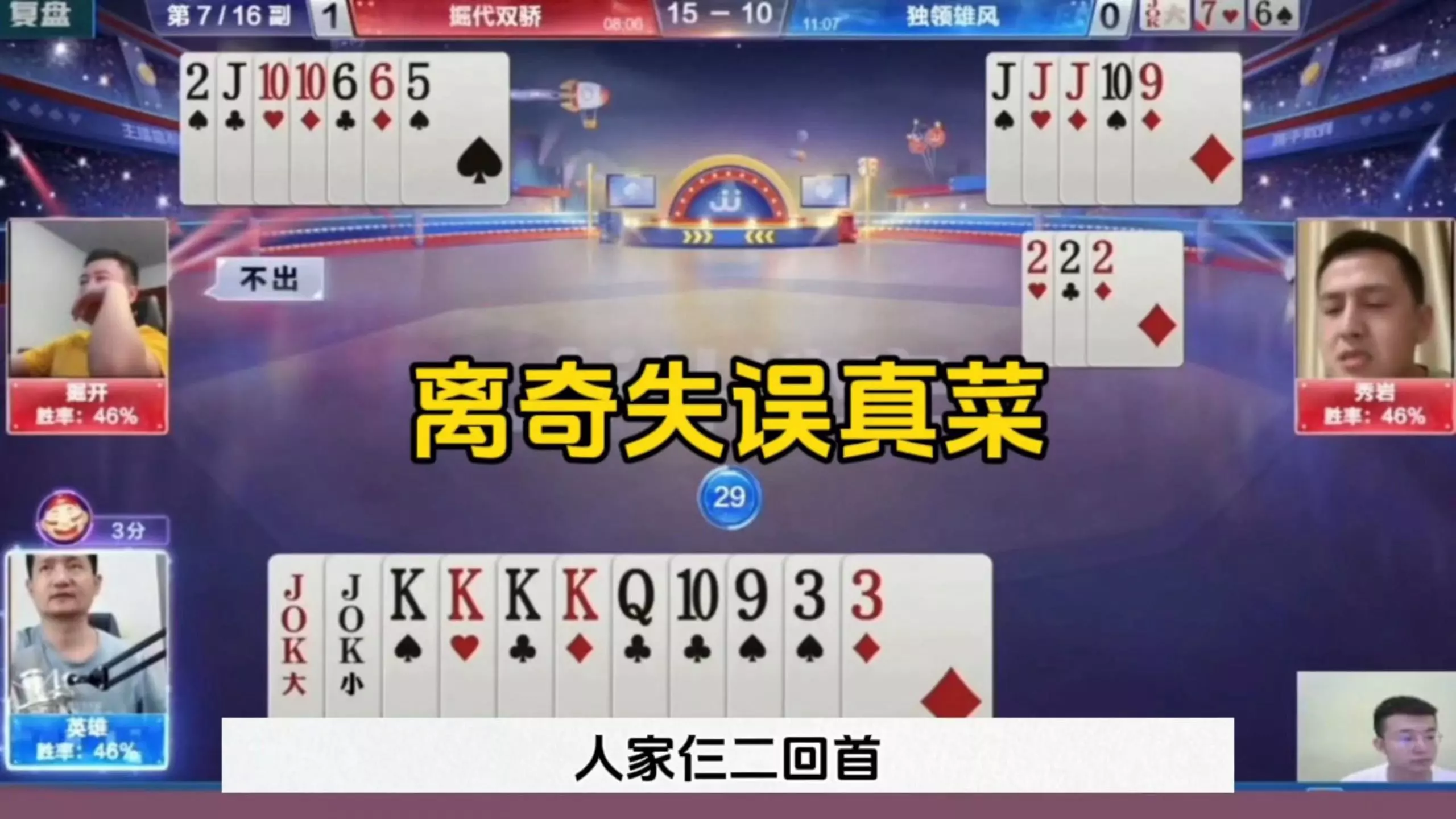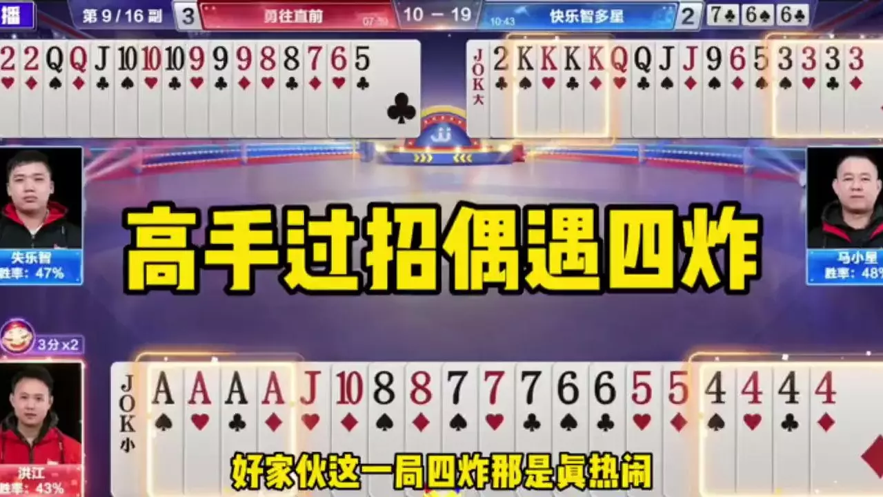 三岁玩牌破釜沉舟四个3的大胆一炸后期残局细腻的行牌为自己争取到了胜利!