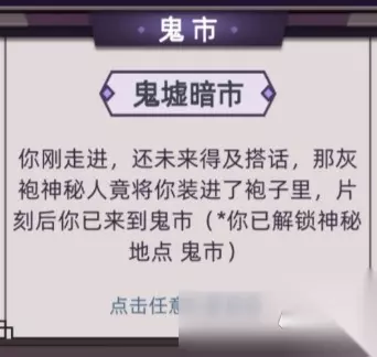 除了日常会遇见一些特殊时间件,直接给你带到鬼市,还有一次是在医馆里有个暗门,点进去就会到鬼市。 生死博弈,将自己的体魄作为赌注,以小博大。成,就是功成名就。败,那么就是一无所有。 五鬼聚宝,如果你有钱,那么这里就是天底下最好的宝库,延年益寿,卖官鬻爵,天下奇物尽在此地。