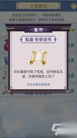 关于鬼市买官: 玩种田流,好不容易攒到数万多亩田,黄金几万两,豪宅宝马不计其数,既然钱有了,当然想要权啦,最后进鬼市想买个官当当,结果它说我伪造官印把我给砍了,还抄了家,结果继承新人生,果真毛都没留下。 然后走纯官场流,到4品官就要达到业绩才能维持官职,发布政策时,发现不点广告每年多发一次政策压根就达不到业绩,降职妥妥的。 不过也有很气人的地方,那就是读书读到八品官员,鬼市看到这个以为好东西,然后买了发现自己变成了九品官员。