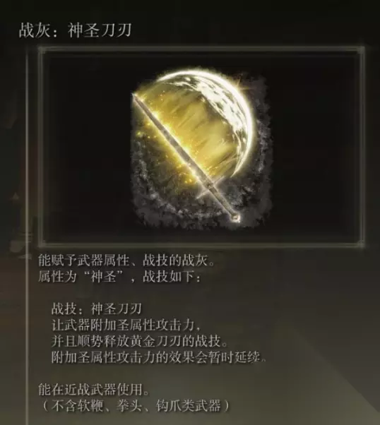 艾尔登法环神圣刀刃战灰怎么获得 获得方法: 神圣刀刃介绍: 该战灰的描述如下