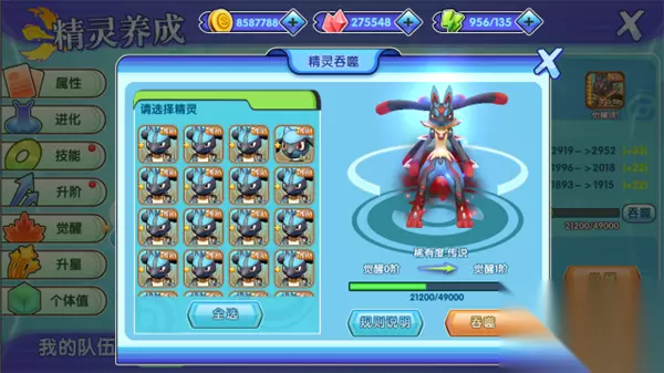 全新觉醒,全新面板! 全新的觉醒系统究竟有什么改动呢?让我们来仔细研究下!通过崭新的觉醒面板,我们可以很清楚的看到,觉醒精灵不再只是单纯的吞噬同一只同品阶精灵,而是新增了觉醒经验条,当觉醒经验条到达100%的时候,便可以直接进行精灵觉醒。 当训练家进行吞噬操作的时候,便可以选择持有的同类型精灵,并且不再有品阶限制,即使是第一形态的精灵也可以用来吞噬了。根据精灵品阶的不同,吞噬后获取的觉醒经验数量也会有所不同。