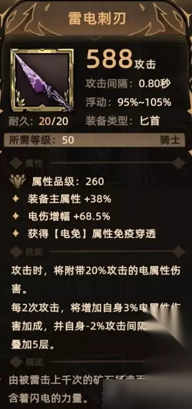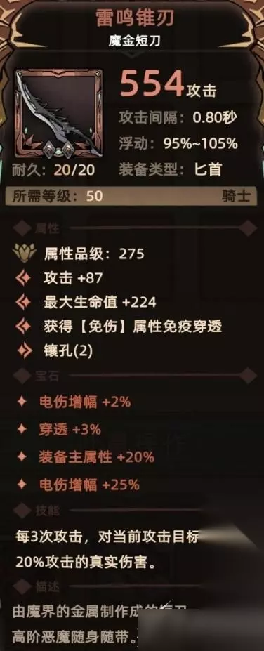 3. 雷鸣锥刃 符文配方:2孔底材+绿色符文【爆鸣】+绿色符文【长锥】 符文属性:装备主属性+20%、电伤增幅+25% 符文技能:无 关键词:装备主属性、电伤增幅。