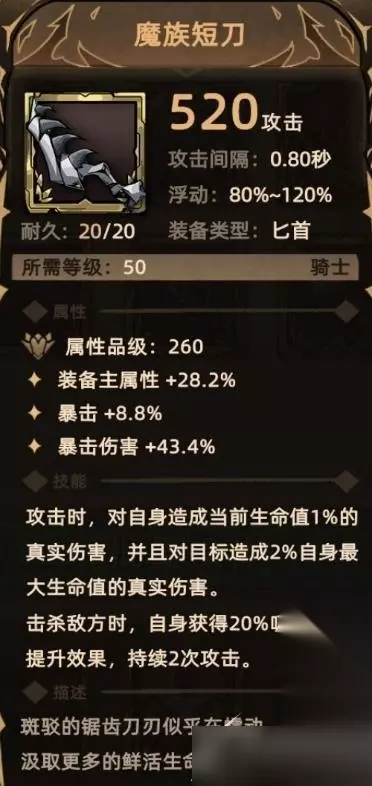 12. 魔族短刀 掉落地点:全局掉落; 关键词:装备主属性、暴击、爆伤、自残、额外伤害(真实伤害)、吸血。