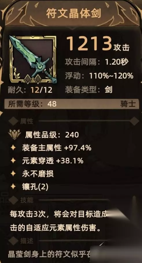 9. 符文晶体剑 掉落地点:全局掉落; 关键词:装备主属性、元素穿透、镶孔、额外伤害(自适应元素伤害)。