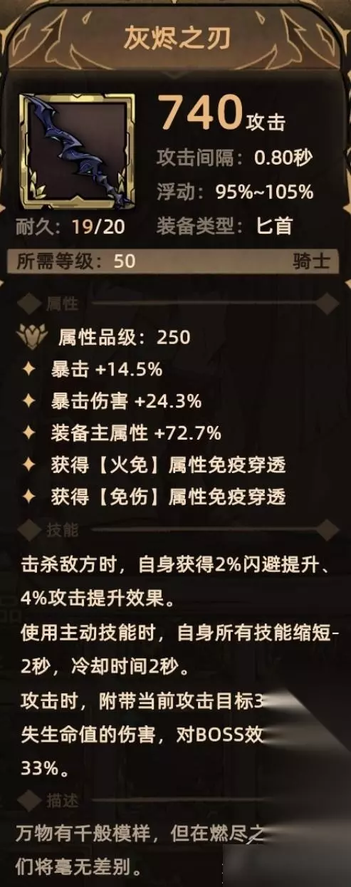 3. 灰烬之刃 掉落地点:魔界深渊-5; 关键词:暴击、爆伤、装备主属性、火免贯通、免伤贯通、闪避、攻击、降低冷却、额外伤害(斩杀伤害)。 Tips:斩杀伤害:根据已损失生命值计算的伤害,目标血量越低对其造成的伤害越高。