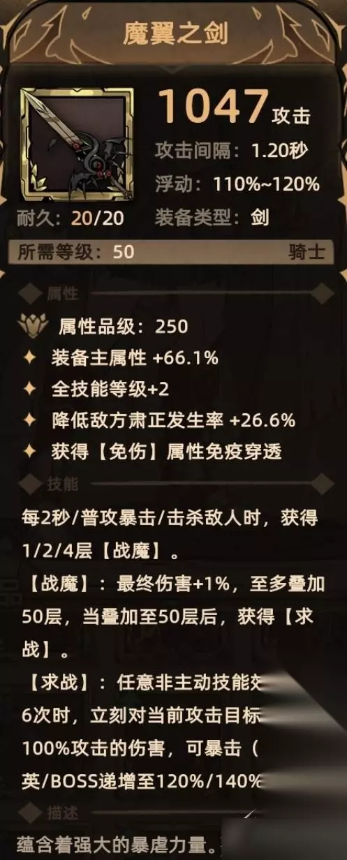 5. 魔翼之剑 掉落地点:魔界腹地-12、魔界深渊-5; 关键词:装备主属性、全技能等级、降低肃正、免伤贯通、最终伤害、额外伤害(物理伤害)。