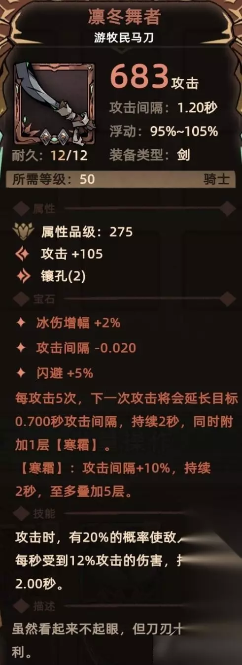4. 凛冬舞者 符文配方:2孔底材+绿色符文【冷冽】+黄色符文【舞者】 符文属性:闪避+5% 符文技能:每5次攻击,下一次攻击延长目标0.7秒攻击间隔,并附加一层【寒霜】 关键词:闪避、延长攻击间隔、寒霜。