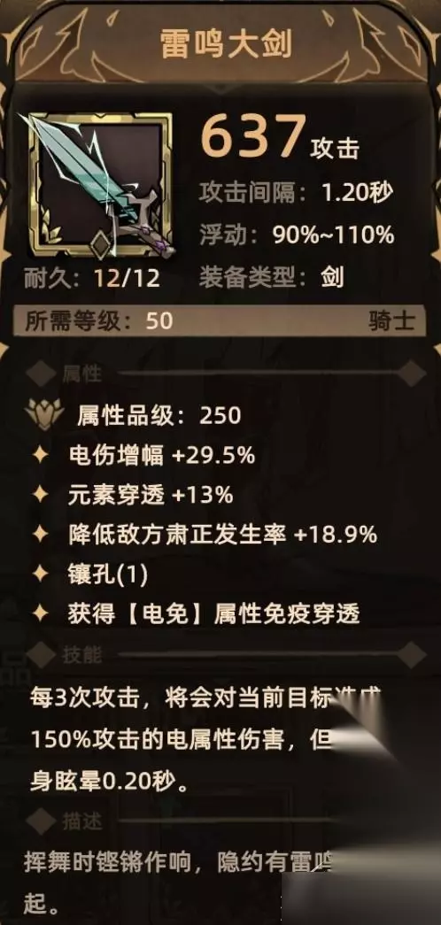 10. 雷鸣大剑 掉落地点:全局掉落; 关键词:电伤增幅、元素穿透、减低肃正、镶孔、电免贯通、额外伤害(电属性伤害)、自身眩晕。