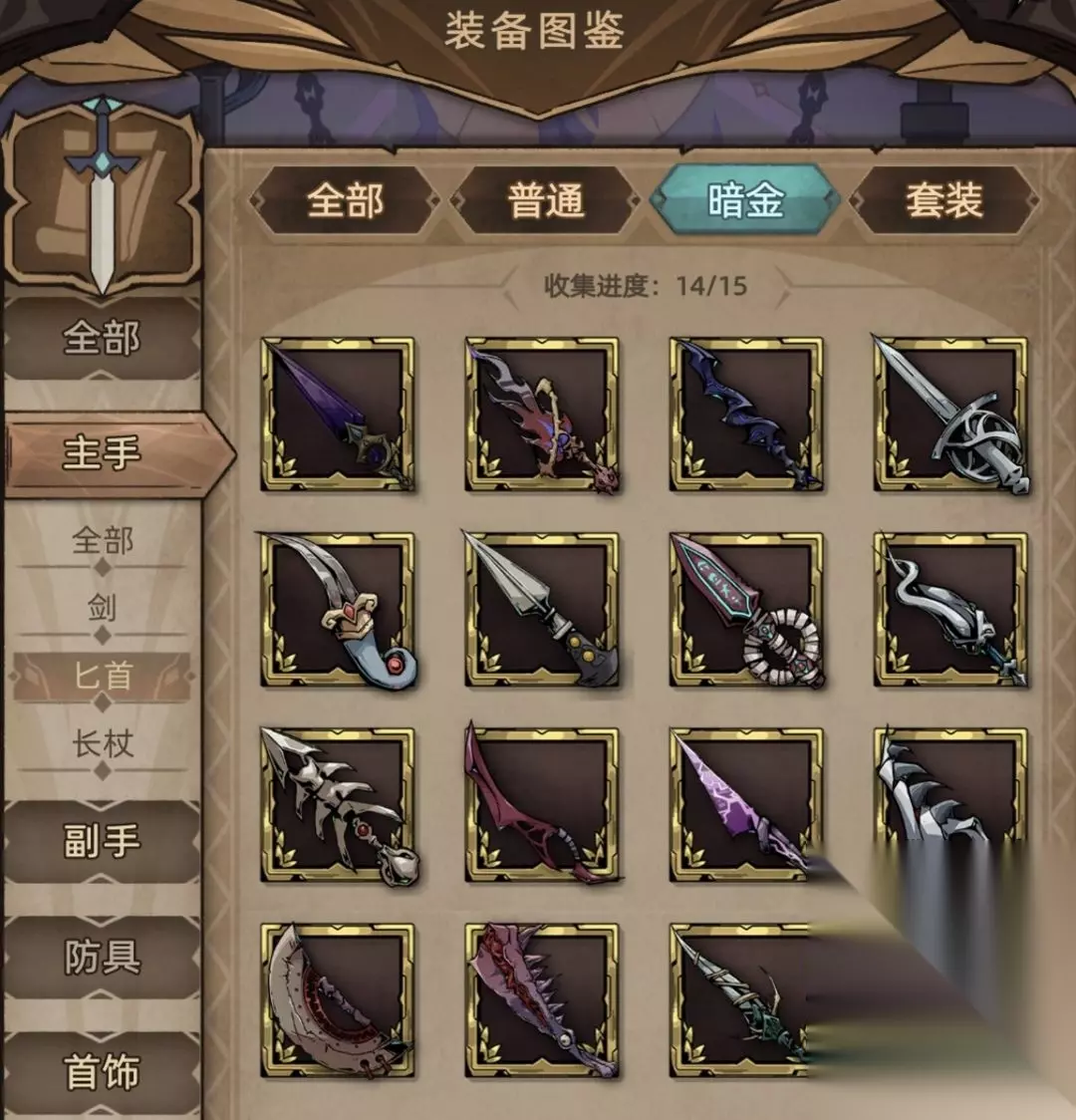 (二)暗金篇-匕首 目前暗金匕首共15件,但第一件匕首【结晶之刺】未实装,游戏内实际可搜集的暗金匕首共14件。