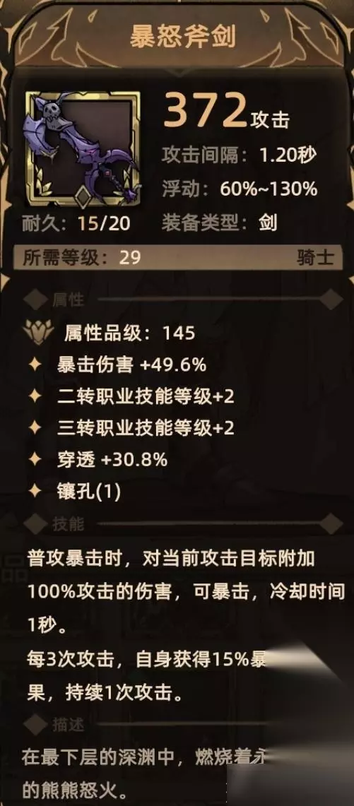 3. 暴怒斧剑 掉落地点:东海岸-6; 关键词:爆伤、二转技能等级、三转技能等级、穿透、镶孔、额外伤害(物理伤害)、暴击。