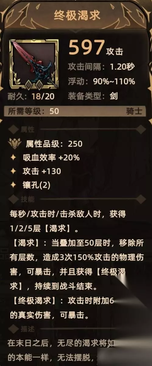 4. 终极渴求 掉落地点:魔界深渊-5; 关键词:吸血、攻击、镶孔、移除buff、额外伤害(物理伤害、真实伤害)。