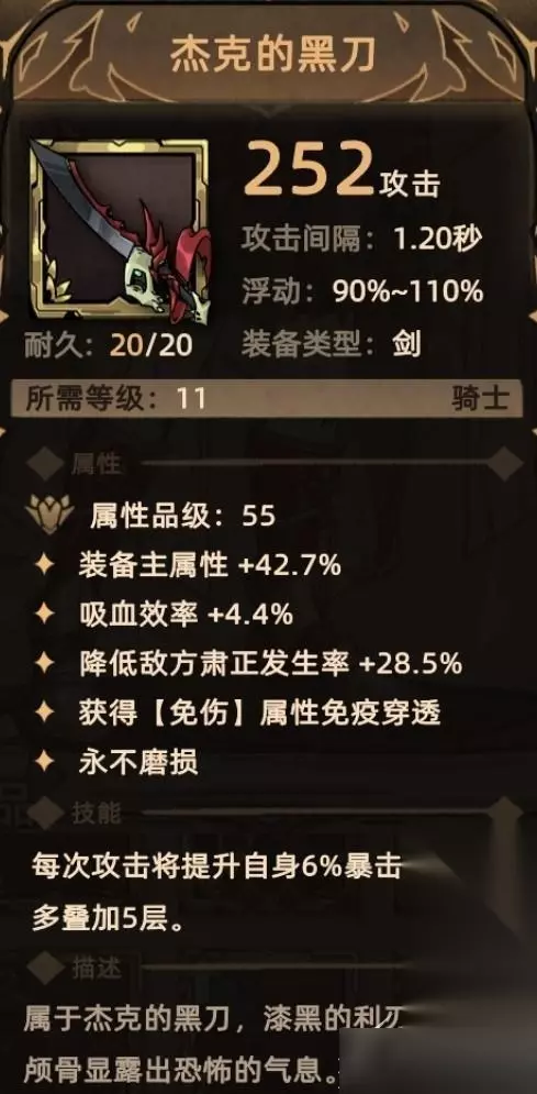 1. 杰克的黑刀 掉落地点:古伦王城外-19; 关键词:装备主属性、吸血、降低肃正、免伤贯通、爆伤。