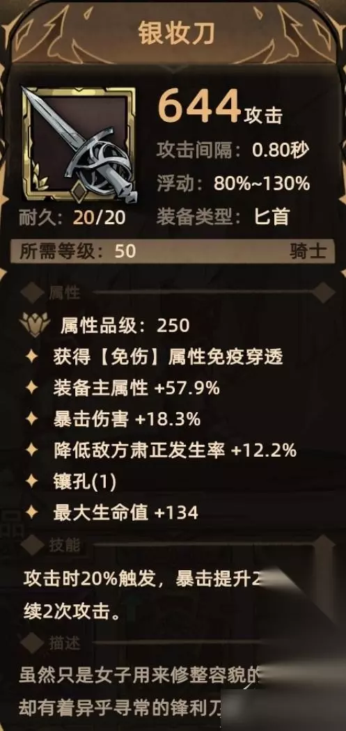 4. 银妆刀 掉落地点:全局掉落; 关键词:免伤贯通、装备主属性、爆伤、降低肃正、生命、镶孔。