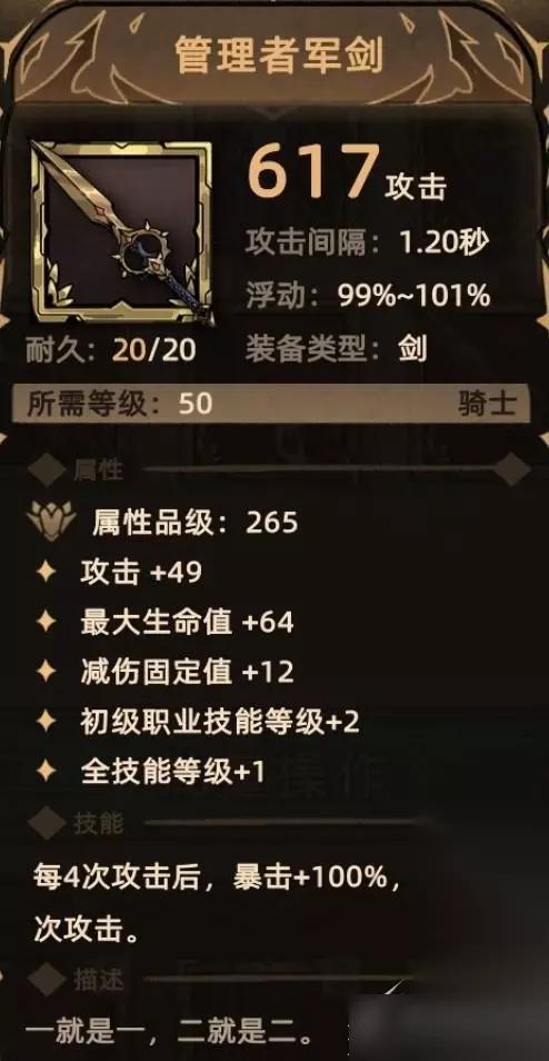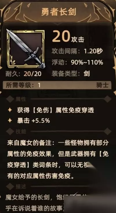 2. 勇者长剑 掉落地点:初始剧情获取,无掉落; 关键词:免伤贯通、暴击。