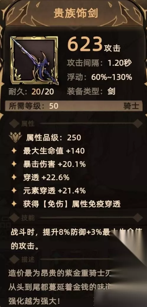 7. 贵族饰剑 掉落地点:全局掉落; 关键词:生命、爆伤、穿透、元素穿透、免伤贯通、攻击。