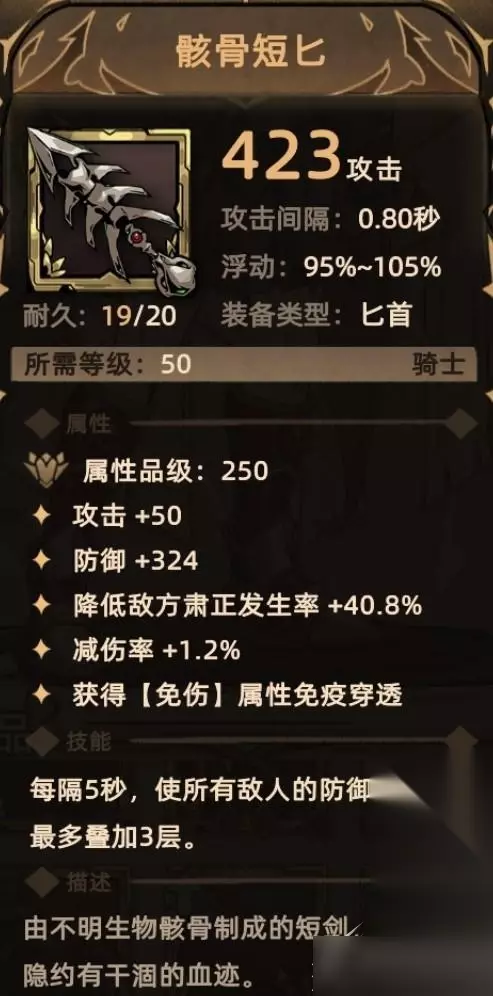 9. 骸骨短匕 掉落地点:全局掉落; 关键词:攻击、防御、降低肃正、减伤、免伤贯通、减防。