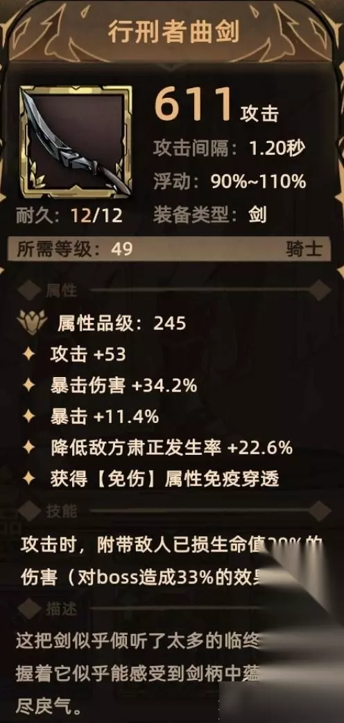 8. 行刑者曲剑 掉落地点:全局掉落; 关键词:攻击、爆伤、暴击、降低肃正、免伤贯通、额外伤害(斩杀伤害)。 Tips:斩杀伤害:根据已损失生命值计算的伤害,目标血量越低对其造成的伤害越高。