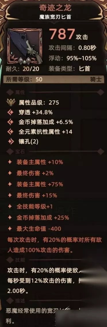 1. 奇迹之龙 符文配方:2孔底材+红色符文【奇迹感】+红色符文【巨龙】 符文属性:装备主属性+75%、最终伤害+15%、全技能等级+1、金币+25%、生命-400 符文技能: 每次攻击,20%概率对所有敌人造成100%攻击的伤害 关键词:装备主属性、最终伤害、全技能等级、金币、降低生命、额外伤害。