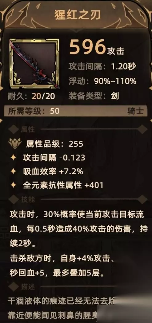15. 猩红之刃 掉落地点:全局掉落; 关键词:降低攻击间隔、吸血、元素抗性、额外伤害(物理伤害)、攻击、生命恢复。