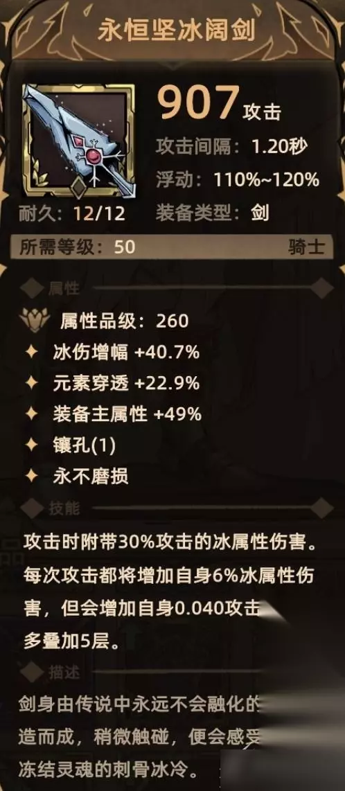 12. 永恒坚冰阔剑 掉落地点:全局掉落; 关键词:冰伤增幅、元素穿透、装备主属性、镶孔、额外伤害(冰属性伤害)、延长自身攻击间隔。