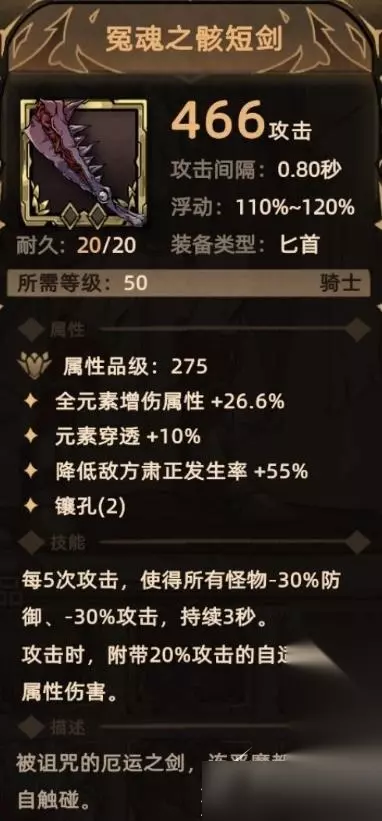 14. 冤魂之骸短剑 掉落地点:全局掉落; 关键词:元素增伤、元素穿透、降低肃正、镶孔、减防、降攻、额外伤害(自适应元素伤害)。