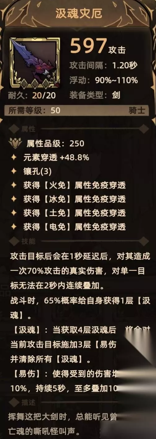 16. 汲魂灾厄 掉落地点:全局掉落; 关键词:元素穿透、火免贯通、冰免贯通、土免贯通、电免贯通、镶孔、额外伤害(真实伤害)、易伤、移除buff。