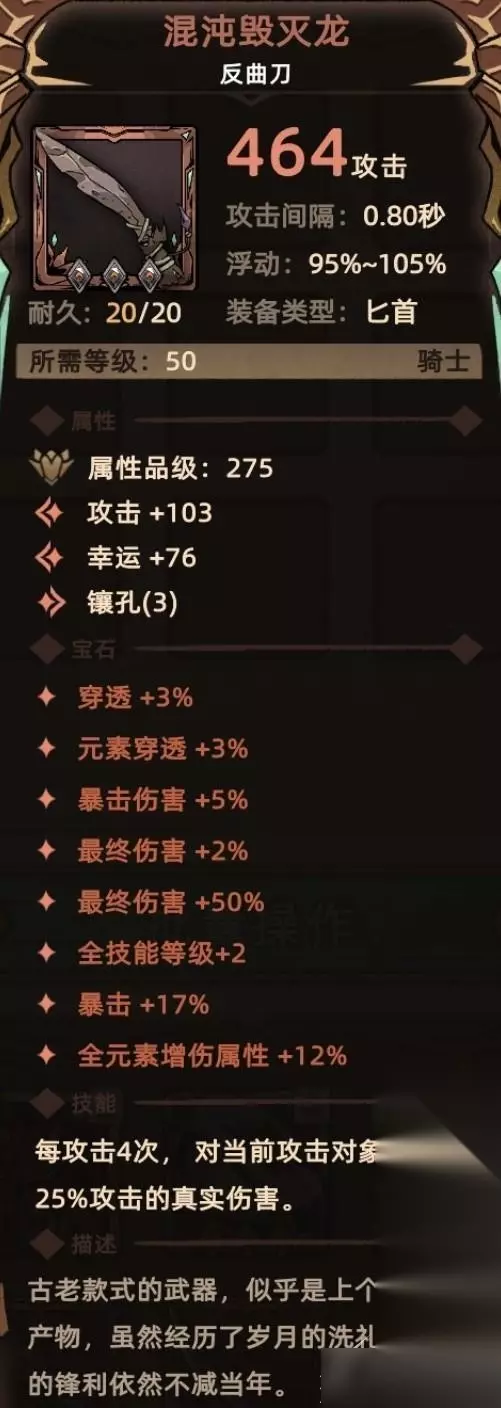8. 混沌毁灭龙 符文配方:3孔底材+黄色符文【混乱】+红色符文【毁灭】+红色符文【巨龙】 符文属性:最终伤害+50%、全技能等级+2、暴击+17%、元素增伤+12% 符文技能:无 关键词:最终伤害、全技能等级、暴击、元素增伤。 Tips:本配方为【匕首】专属符文之语配方,底材只能为【匕首】