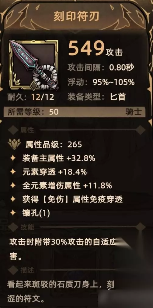 7. 刻印符刃 掉落地点:全局掉落; 关键词:装备主属性、元素穿透、元素增伤、免伤贯通、镶孔、额外伤害(自适应元素)。
