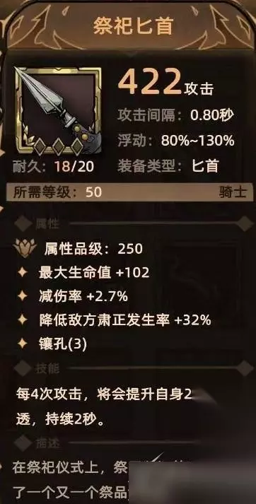 6. 祭祀匕首 掉落地点:全局掉落; 关键词:生命、减伤、降低肃正、镶孔、穿透。