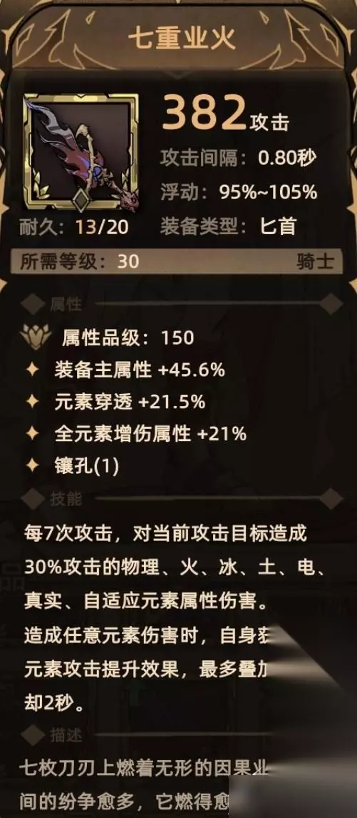2. 七重业火 掉落地点:东海岸-6; 关键词:装备主属性、元素穿透、元素增伤、镶孔、额外伤害(物理属性、火属性、冰属性、土属性、电属性、真实伤害、自适应元素伤害,共7种类型伤害)。