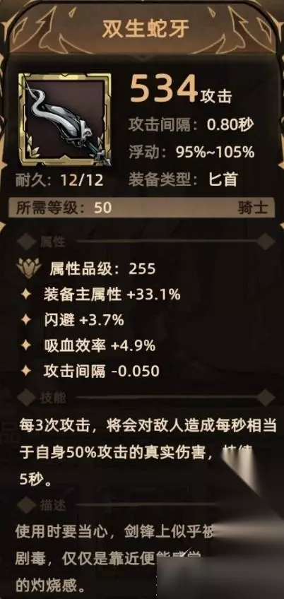 8. 双生蛇牙 掉落地点:全局掉落; 关键词:装备主属性、闪避、吸血、攻击间隔、额外伤害(真实伤害)。