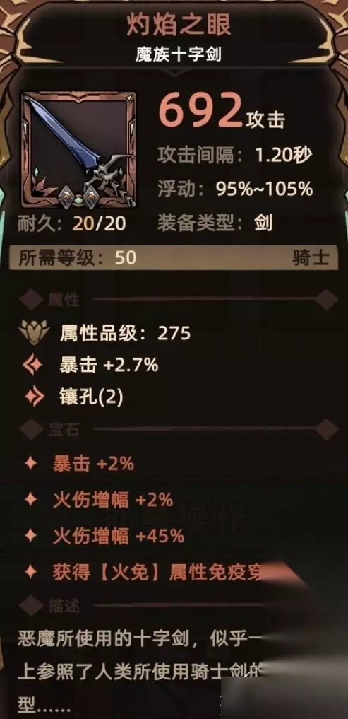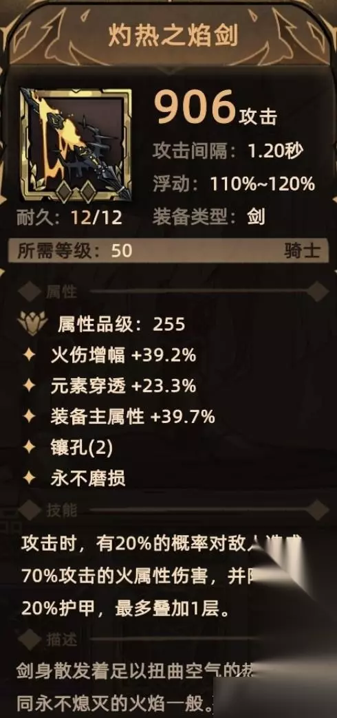 11. 灼热之焰剑 掉落地点:全局掉落; 关键词:火伤增幅、元素穿透、装备主属性、镶孔、额外伤害(火属性伤害)、减防。