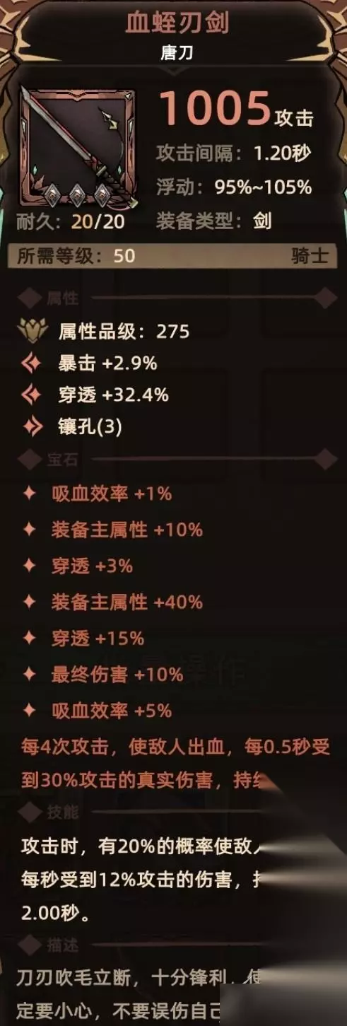 6. 血蛭刃剑 符文配方:3孔底材+黄色符文【汲取】+红色符文【奇迹感】+绿色符文【长锥】 符文属性:装备主属性+40%、穿透+15%、最终伤害+10%、吸血效率+5% 符文技能:每4次攻击,使敌人出血,每0.5秒受30%攻击的真实伤害,持续2秒 关键词:装备主属性、穿透、最终伤害、吸血、额外伤害(真实伤害)。