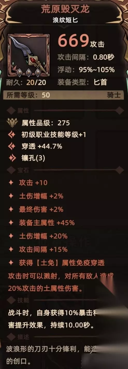 5. 荒原毁灭龙 符文配方:3孔底材+黄色符文【湮灭】+绿色符文【荒芜】+红色符文【巨龙】 符文属性:装备主属性+45%、土伤增幅+20%、攻击间隔+15%、【土免】贯通 符文技能:每次攻击对所有敌人造成额外20%攻击的土属性伤害 关键词:装备主属性、土伤增幅、自身攻击间隔延长、土免贯通、额外伤害(土属性)。