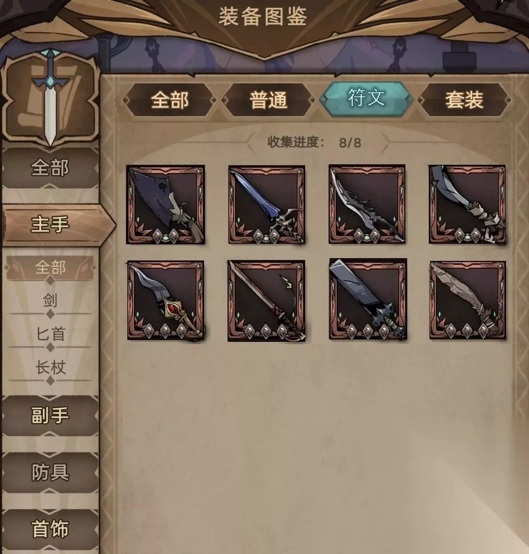 (三)符文之语篇 目前骑士符文之语主手武器共8件。 Tips1:符文之语装备的所有效果为【宝石】下红字部分,装备的【属性】、【技能】均为底材原有的词条和特效,与符文之语效果无关。 Tips2:截止到2023年2月2日,符文之语装备外观为底材原有外观(专属外观未实装),因此暂以本人的符文之语装备外观代替。 Tips3:绿色符文=下位符文,黄色符文=中位符文,红色符文=上位符文 Tips4:目前骑士符文之语主手武器中,有6件的底材既可以是匕首也可以是剑,有1件专属匕首符文之语、1件专属剑符文之语。