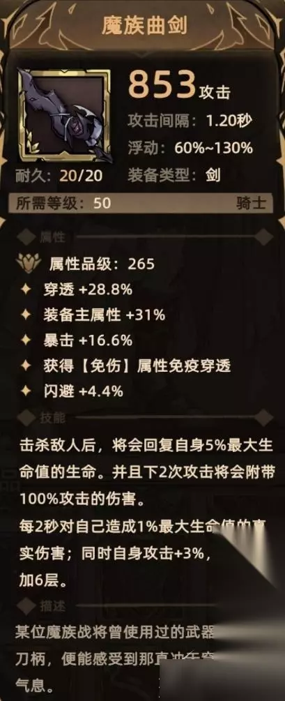 13. 魔族曲剑 掉落地点:全局掉落; 关键词:穿透、装备主属性、暴击、免伤贯通、闪避、生命恢复、额外伤害(物理伤害)、自残、攻击。