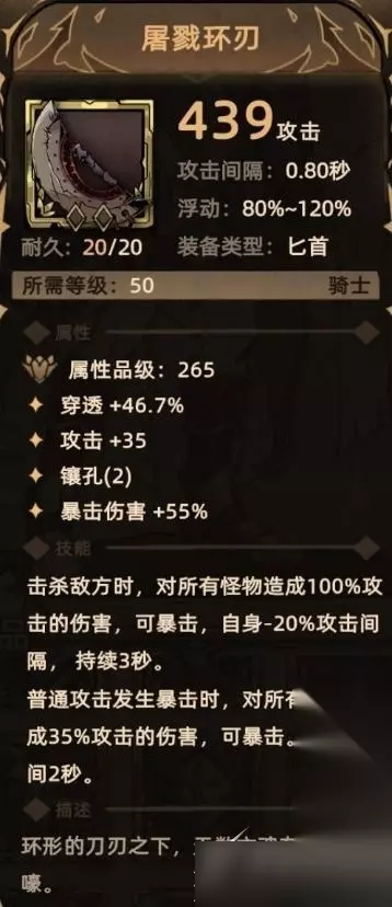 13. 屠戮环刃 掉落地点:全局掉落; 关键词:穿透、攻击、爆伤、镶孔、额外伤害(物理伤害)、降低攻击间隔。