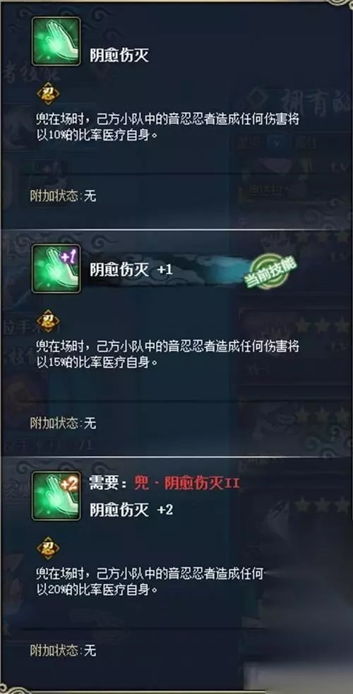 技能突破1:阴愈伤灭,当兜在场时,己方小队的音忍忍者造成的任何伤害会以10%、15%或20%的比例治疗自身。也就是说当兜在的时候,其他忍者包括召唤的分身,奥义或者普攻或者追打都会对自身造成治疗。比如君麻吕奥义造成共计10000点伤害就会治疗君麻吕1000、1500或者2000的生命。