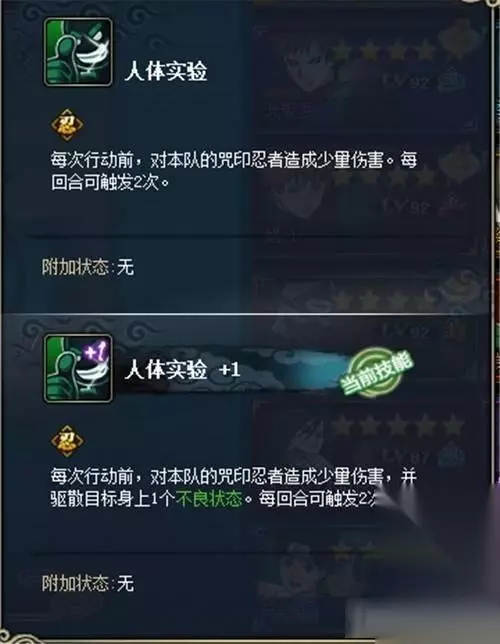 技能突破2:人体实验,这个可以说是兜突破的核心了,突破后增加了一个驱散不良的效果,而且可以触发两次。同其他恢复忍者不同,兜是先驱散,再治疗,即便是被点燃了也依然可以恢复生命,而且治疗还可以再驱散1层不良,也就是说,兜每回合最多可以驱散掉4层不良状态。
