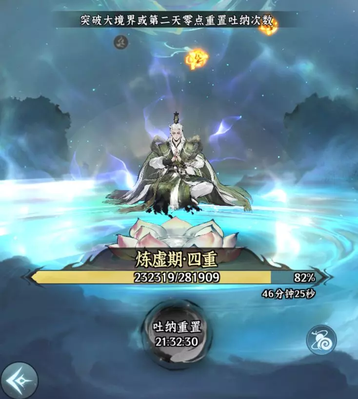 每日您可进行多次吐纳,每次吐纳均可获得大量修为,但每日吐纳次数存在上限,仅在突破大境界或次日零点时重置吐纳次数,大境界越高则可吐纳次数越多。若当日零点前即可突破至境界,建议直接突破,以此增加吐纳重置的次数与修为获取量。