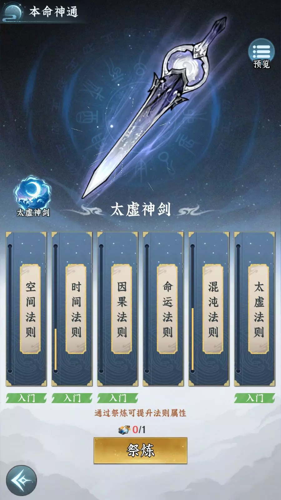 提升宗门规模后可获取“法则碎片”道具,用以激活掌教师叔您的本命神通技能,包含空间法则、时间法则、因果法则、命运法则、混沌法则、太虚法则这6个。每种法则会对应提升不同的属性,同时分为入门、精通、小成、大成和圆满5个境界。