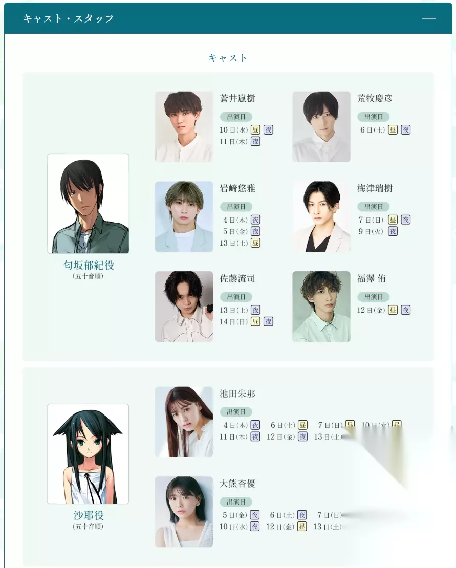 男主角勾坂郁紀由六位才华横溢的年轻演员倾情演绎,加上两位通过试镜选拔的沙耶扮演者,他们为这部作品注入了丰富多彩的化学反应,超越了“朗诵剧”的范畴,提供了令人毛骨悚然的恐怖体验,以及对人类力量和美丽、丑陋和愚蠢的对立描述,以及最终存在于这一切之中的终极爱情形式的美学描绘。