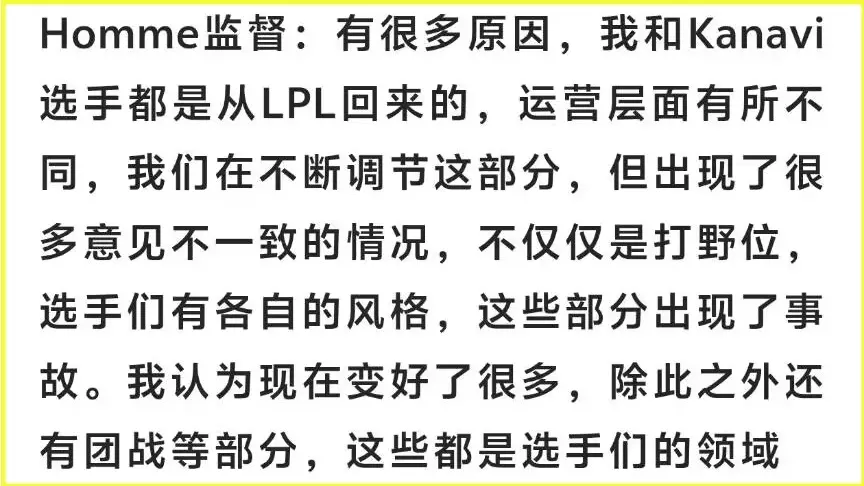 红米每次输比赛,都会提一嘴LPL,这次也不例外,红米采访被提问:HLE对比其他强队,不足的地方是什么?红米回应:原因有很多,我和Kanavi都是从LPL回来的,运营层面有所不同,我们不断调节这部分,但还是出现意见不一致的情况,不仅是打野,其他选手也都有自己的风格。
