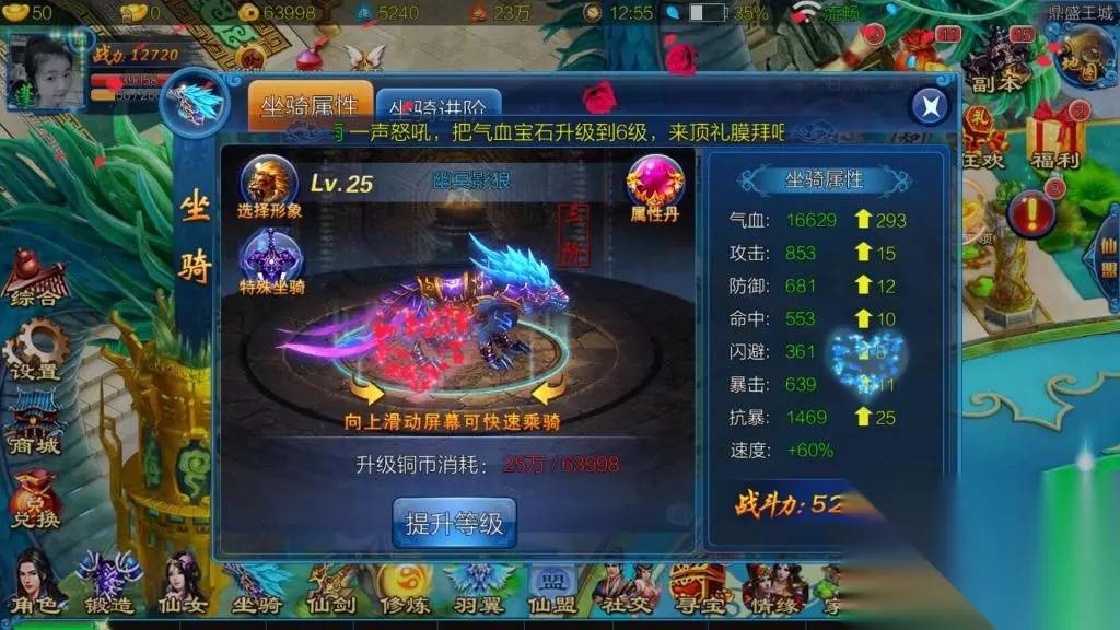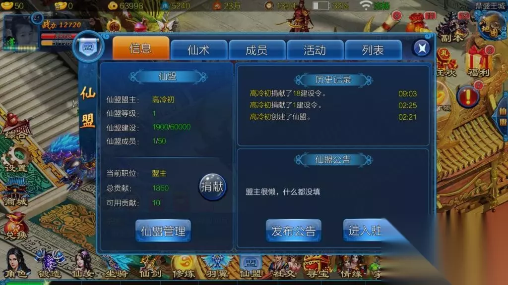 当到达一定的等级之后,就开启了仙盟系统,可以选择任意的仙盟申请加入或自己用铜币创建仙盟,当选择其中之一后,就成功地有了仙盟,在仙盟中有很多的活动,下面来给大家举部分例吧: 一.仙盟运势 ①.仙盟成员可互相进行祝福,提高对方运势 ②.仙盟运势印象当日仙盟任务,仙盟酒会的收益,以及击杀仙盟boss时的双倍掉落率。 ③.没人最多进行20次祝福 ④.每日6::00仙盟运势归零 ⑤.退出仙盟时运势归零 二.仙盟酒会 由盟主或副盟主开启,仙盟领地将产出仙酒,采集可以获取经验丶真气丶仙盟贡献等奖励。 后面更有仙盟凶兽,仙盟秘境,仙盟争霸等活动玩法,十分丰富又好玩让更多的仙盟的成员能够有更好游戏交流。 7、坐骑系统