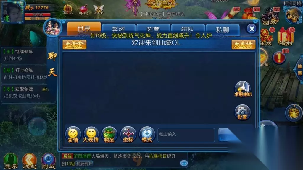 《仙域ol》中的副本分为好几方面,经验丶武器材料丶防具材料丶品质材料丶商城道具这五个方面, 过关相应的副本就能领取到一定的奖励。 在这几个方面的设计,尤其是商城道具,像其它游戏的东西,很多都是要冲钱才能购买,而《仙域ol》就不一样,它设计了商城道具副本,就是让更多平民玩家,能够不花钱,通过自己的努力,获得自己想要的东西,通关后,也是可以直接扫荡,副本更是全天无限制开放,如此的设计,相信赢得了不少玩家的芳心。 5、互动系统 ①.聊天系统